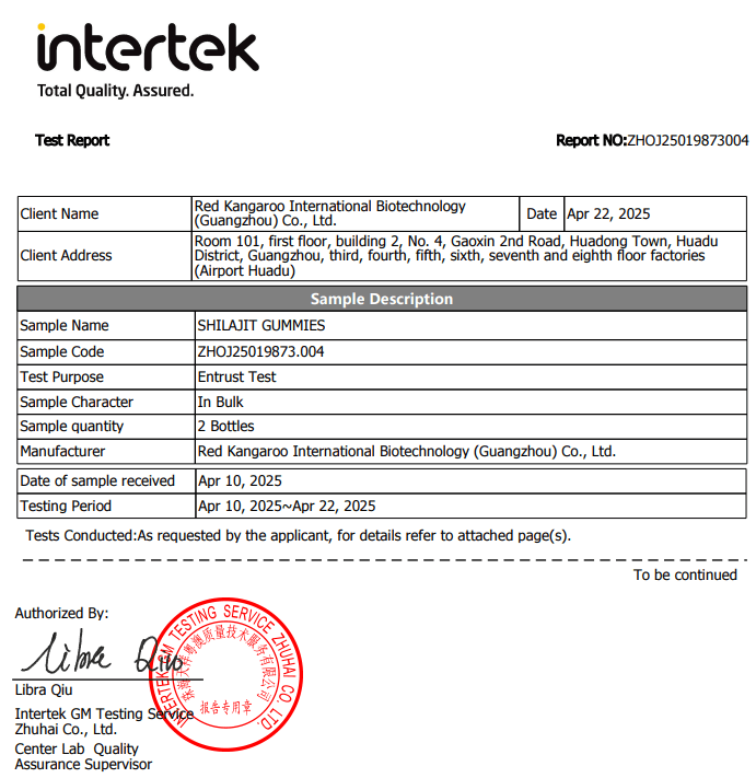 Shilajit Gold Gummies pasó pruebas clave de seguridad y calidad analizado por Intertek, laboratorio internacional de prestigio.